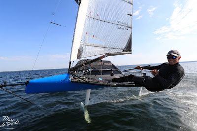 En fait cette photo est très spéciale c'est le jour de mon entretien d'embauche. Je suis sous le vent avec ITA74. Arrivé à la base le matin pour un rendez vous avec Francesco il me propose de venir voir l'entraînement. Au bout d'une heure il me demande si je veux barrer ??? Deux régates plus tard toutes les deux gagnées (la chance du débutant) j'ai mon contrat sur la table.